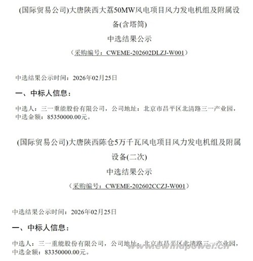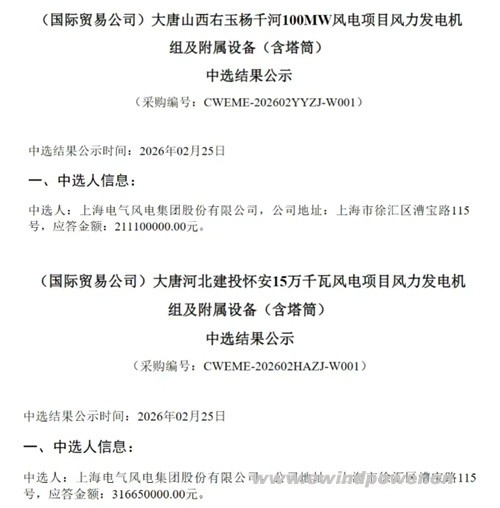 根据公示结果,上海电气风电集团股份有限公司中标两个重点项目:山西右玉杨千河100MW风电项目和河北建投怀安150MW风电项目,中标金额分别为2.111亿元和3.1665亿元。三一重能股份有限公司则斩获陕西大荔50MW风电项目和陕西陈仓50MW风电项目,中标金额分别为0.8535亿元和0.8335亿元。