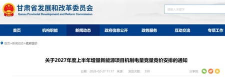 2月27日,甘肃省发展和改革委员会、省工业和信息化厅、省能源局、国家能源局甘肃监管办公室联合发布《关于2027年度上半年增量新能源项目机制电量竞量竞价安排的通知》,正式启动2027年度上半年增量新能源项目机制电量竞量竞价工作。这是甘肃深化新能源上网电价市场化改革、推动新能源高质量发展的又一重要举措。