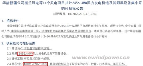 3月5日,华能集团一纸招标公告,为2026年的风电市场投下“开年惊雷”。其电子商务平台发布公告,将对旗下“华能新疆公司楼兰风电等14个风电项目共计2456.4MW风力发电机组及其附属设备”进行集中采购公开招标。