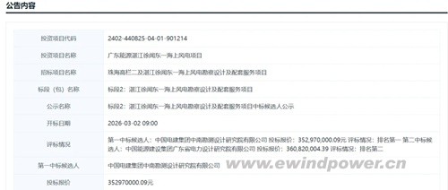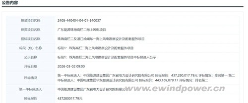 近日,广东省海上风电开发再传捷报,为“马年”开局注入强劲动能。广东省公共资源交易中心于3月6日发布《珠海高栏二及湛江徐闻东一海上风电勘察设计及配套服务项目中标候选人公示》公告,两大项目中标金额合计近8亿元人民币,标志着广东深远海风电规模化开发迈出关键一步。