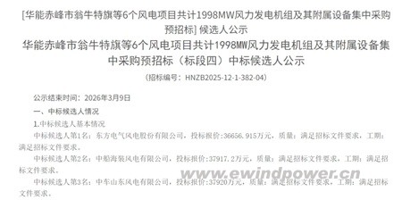3月6日,中国华能电子商务平台发布《华能赤峰市翁牛特旗等6个风电项目共计1998MW风力发电机组及其附属设备集中采购预招标(标段四计为240MW)中标候选人公示》。公告显示,东方电气风电股份有限公司 以约3.67亿元的报价,成为该标段的第一中标候选人。中船海装风电有限公司与中车山东风电有限公司分别位列第二、第三中标候选人。