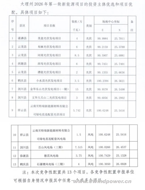 所有项目分布在大理州下辖的多个县区,并给出了明确的时间表:计划于2026年6月开工,目标在2027年2月实现并网投产,建设周期紧凑,对投资开发企业的执行力提出了明确要求。
