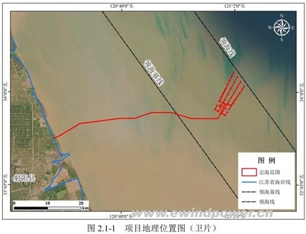 中海油江苏滨海南区H4-2#海上风电项目选址于盐城市滨海县近海海域。场区中心离岸约39公里,规划海域面积约48平方公里,水深在17-18米之间。