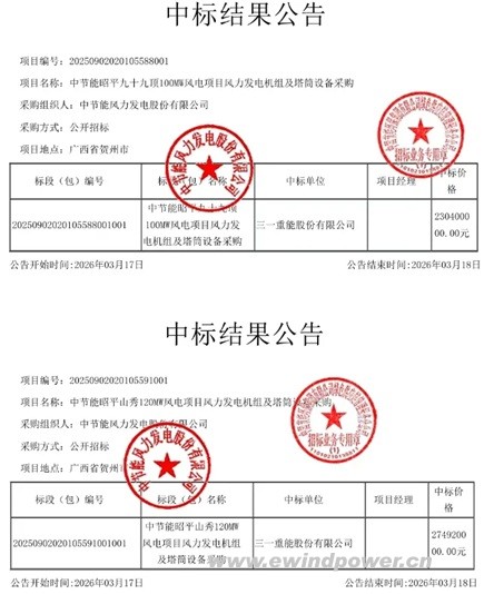 近日,中节能风力发电股份有限公司两大风电项目机组及塔筒采购中标结果接连公示,三一重能股份有限公司成功中标全部标段,独揽两大订单,合计中标金额超过5亿元,再次展现了其在风电整机市场,特别是在大型风电基地项目中的强劲竞争力。