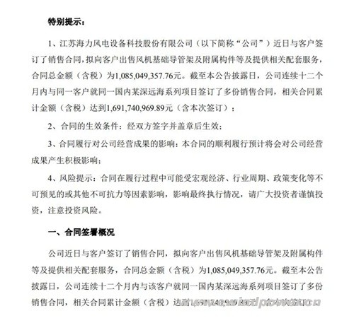 海上风电正加速驶向深蓝,核心装备制造商率先斩获“深海通行证”。近日,江苏海力风电设备科技股份有限公司发布重大合同公告,宣布成功签订一份价值10.85亿元(含税) 的深远海风电风机基础导管架及附属构件销售与服务合同,标志着公司在深远海市场实现重大突破。