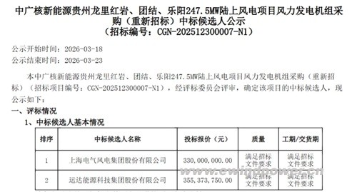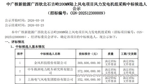 3月18日,中广核新能源同期发布广西钦北石古岭200MW和贵州龙里红岩、团结、乐阳合计247.5MW两个陆上风电项目风机采购的中标候选人公示。两项目总计容量达447.5MW,是继几大央企集团集中采购后,对风机市场价格与竞争格局的又一次重要呈现。