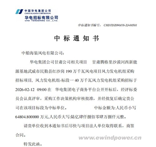 根据中标通知书,中船海装成功中标“甘肃腾格里沙漠河西新能源基地武威市民勤县红沙岗1.9GW风电项目”的风力发电机组采购标段一,即“华电甘肃武威民勤红沙岗400MW风电项目”。该项目于2026年2月12日在华电集团电子商务平台公开开标,经规范严格的评标与审批流程,最终确定中船海装为中标单位,中标金额为人民币648,048,000元(大写:陆亿肆仟捌佰零肆万捌仟元整)。