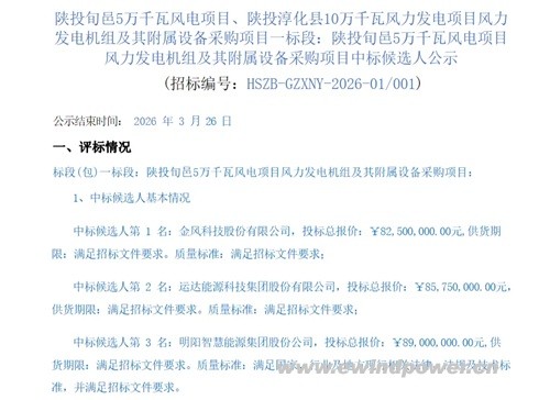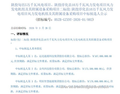 3月23日,陕投电子招标平台发布重磅公示,公布了陕投旬邑50MW风电项目与陕投淳化县100MW风力发电项目的风力发电机组及其附属设备采购中标候选人结果。两大项目总计150MW的风机采购大单,吸引了金风科技、运达股份、明阳智能等头部整机商激烈竞逐,最终金风科技与运达股份分别成为两个项目的第一中标候选人。