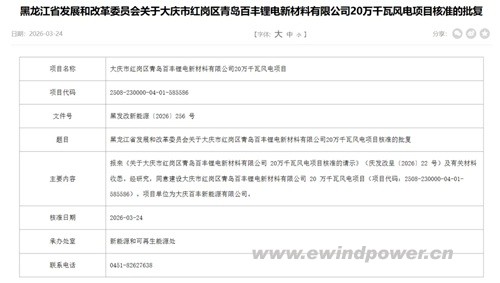大庆市红岗区青岛百丰锂电新材料有限公司20万千瓦风电项目:项目单位为大庆百丰新能源有限公司。其背后投资方青岛百丰为锂电新材料领域企业。这一布局颇具看点,或意在为相关材料生产提供绿色电力支持,探索“绿色电力+新材料制造”的产业耦合模式。