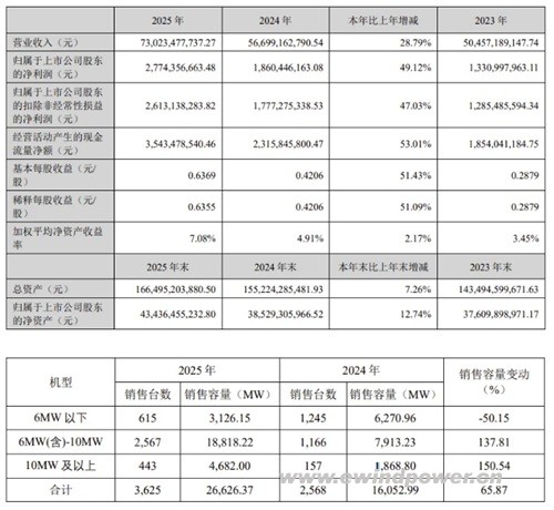 报告期内,公司最核心的风力发电机组及零部件销售收入达572.05亿元,同比增长46.98%,占总营收的78.34%。2025年,公司实现风机对外销售容量26,626.37兆瓦,同比激增65.87%,市场需求旺盛。