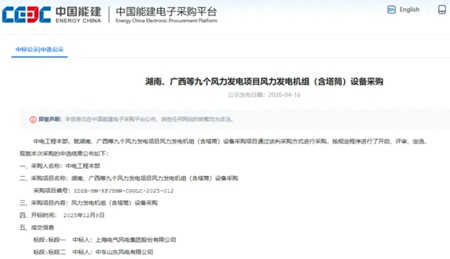 4月16日,中国能建湖南、广西等九大风电项目风力发电机组(含塔筒)设备采购开标,总规模达924.5MW。电气风电预中标标段一(407.5MW),中车山东风电预中标标段二(517MW)。