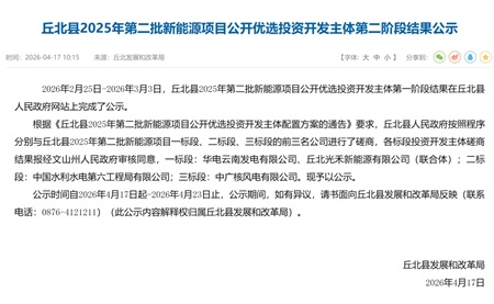 4月17日,云南丘北县2025年第二批新能源项目公开优选投资开发主体第二阶段结果公示,共三个标段、总规模610MW,华电云南、中国水电六局、中广核风电分获各标段开发权。