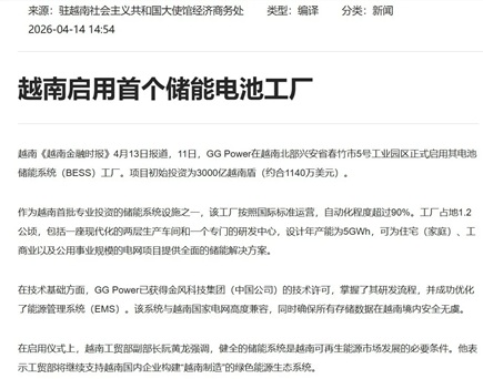 近日,中华人民共和国商务部官网刊登《越南金融时报》报道——金风科技与越南GG Power携手共建的电池储能系统(BESS)工厂在越南兴安省正式投产。该工厂作为越南首批专业储能设施之一,占地1.2公顷,设计年产能达5GWh,自动化程度超过90%,可覆盖住宅、工商业及公用事业等多元应用场景。