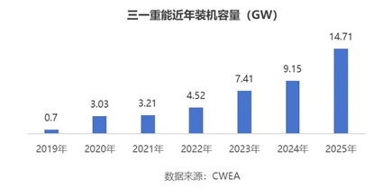 回顾2025年,面对国内陆上风机中标价格下行及新能源上网电价市场化改革带来的利润空间压缩,三一重能全年实现营业收入273.80亿元,同比增长53.89%,展现了强劲的营收扩张能力。尽管受价格因素拖累,归母净利润同比下降60.69%至7.12亿元,但公司核心业务展现出强大的抗风险特质。随着报告期内风机中标价格逐步回升,公司盈利修复通道已然打开。