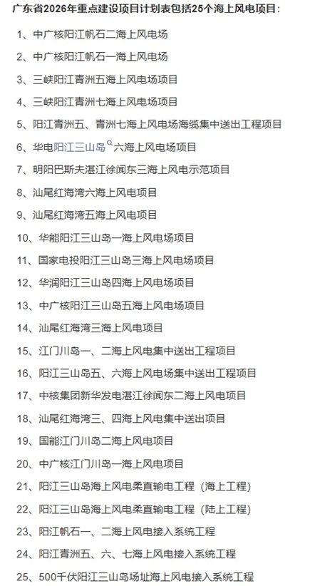 4月23日,广东省发展和改革委员会正式发布《关于下达广东省2026年重点建设项目计划的通知》。经梳理,海上风电成为本轮扩投资的绝对主角——共有25个项目列入重点建设项目计划,另有11个项目纳入重点建设前期预备项目,合计36个海上风电项目加速布局。