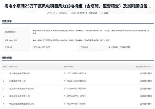 4月24日,粤电小草湖25万千瓦风电项目风力发电机组(含塔筒、配套箱变)及其附属设备采购正式开标。三一重能、远景能源、东方风电、中车山东风电、明阳智能五家头部整机商参与竞标。